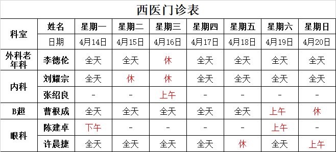 太湖中医医院《2025-04-14至2025-04-20》排班表