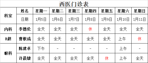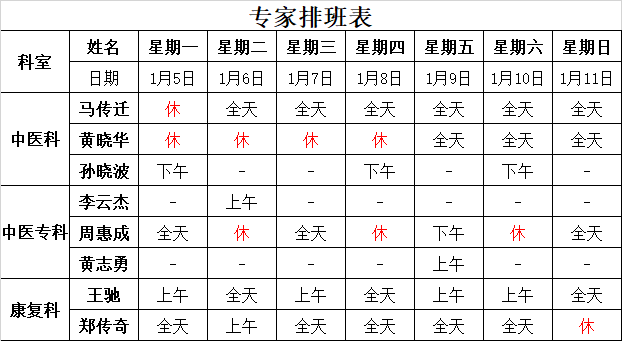 太湖中医医院《2026-1-5至2026-1-11》排班