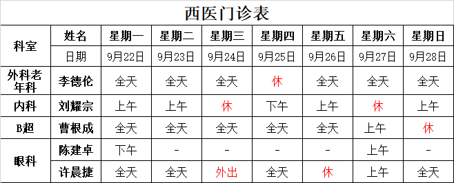 太湖中医医院《2025-09-22至2025-09-28》排班表