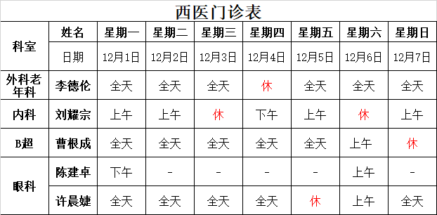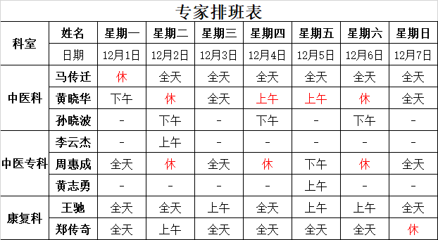太湖中医医院《2025-12-1至2025-12-7》排班表