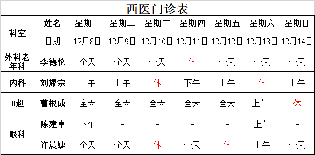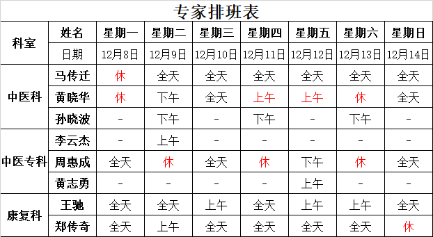 太湖中医医院《2025-12-8至2025-12-14》排班表
